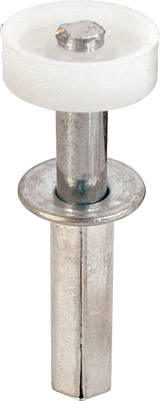 Steel base; fits Acme and Cox doors. 1/4 in W nylon wheel with 7/16 in OD x 1-1/2 in H steel base self-adjusts from 1-7/8 to 2-1/2 in in track for smooth guiding of lead door. For 1 to 1-3/8 in thick bi-fold doors up to 30 lb each.