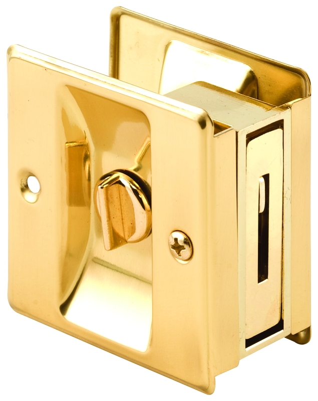 N 6771 is a solid brass privacy lock and pull for a pocket door with an polished brass finish. It fits doors that are 1-3/8 to 1-3/4 in thick. It is 2-3/4 in tall and can be reversed from left handed to right handed.