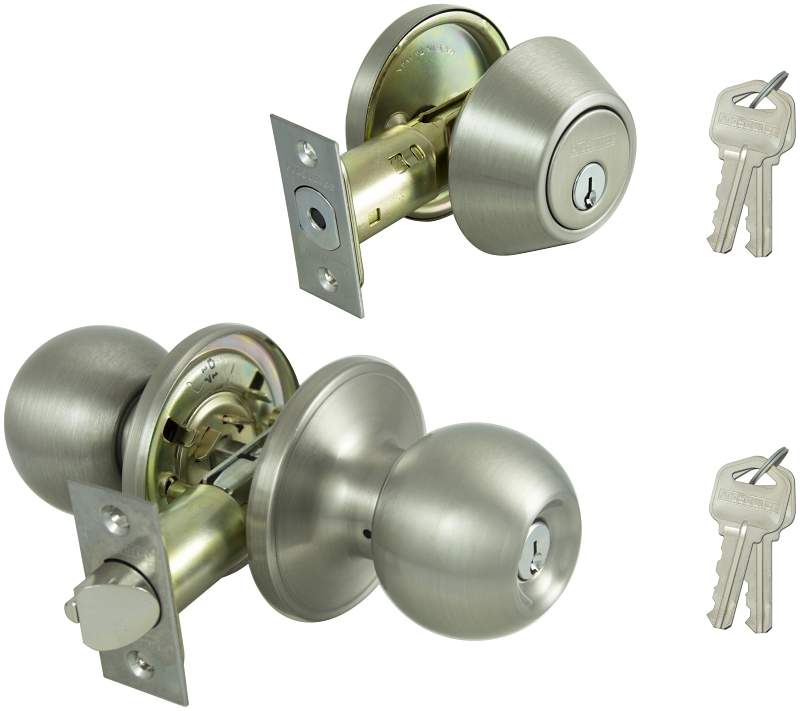The combination lockset entry lockset and deadbolt lock or unlock by key outside and turn piece inside. All-metal components.