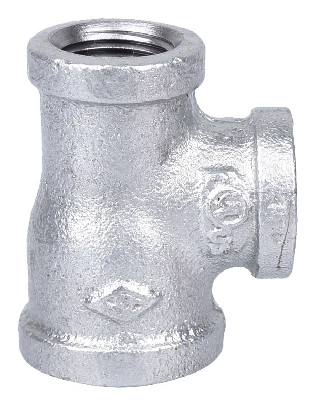 This galvanized tee is used to change direction in piping for use with water or steam. It meets ANSI standard with flat banded, right hand threads standard screw.