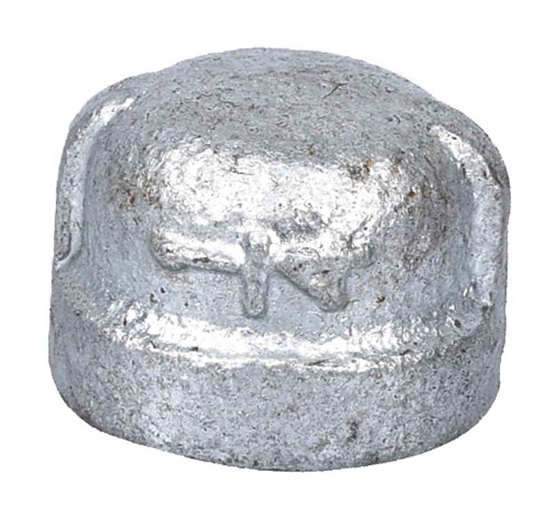 The galvanized cap is a class 150 malleable iron pipe fitting that is used for closing and terminating the male end of a pipe or fitting.