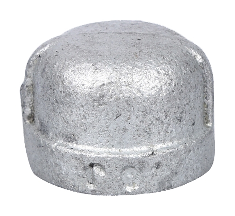 The galvanized cap is a class 150 malleable iron pipe fitting that is used for closing and terminating the male end of a pipe or fitting.