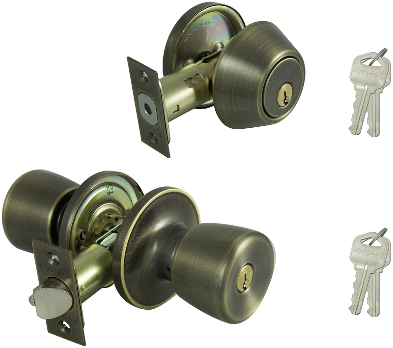 The combination lockset entry lockset and deadbolt lock or unlock by key outside and turn piece inside. All-metal components.