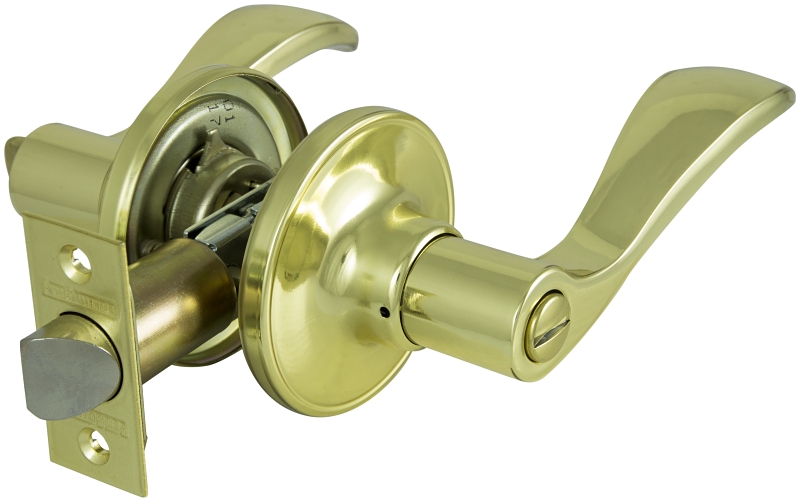 The leverset is for bedroom or bathroom doors. Both levers locked or unlocked by turn button inside or emergency key outside. It has a reversible handing and an adjustable six-way latch and radius round corner strike.
