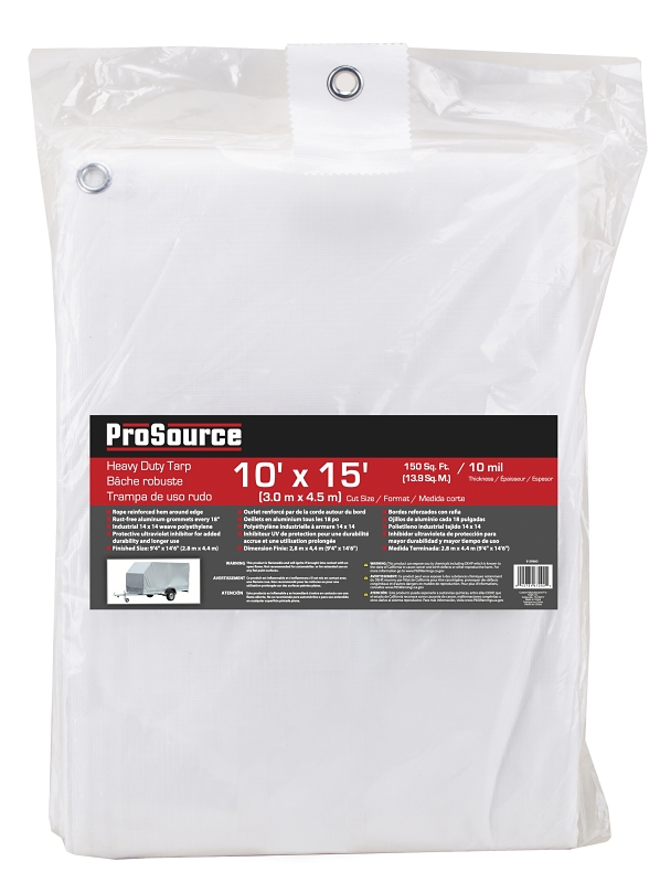 ProSource Tarp, Plastic, White, 15 ft L, 10 ft W, 10 mil Thick, Grommet Spacing: 18 in, Grommet Material: Aluminum, Resists: Sunlight, Tear, UV Rays, Water, Suitable for: Camping, hunting, tent fly, storage cover, canopy, boat cover, woodpile cover