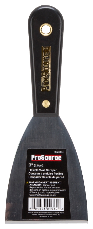 The ProSource wall scraper has a heat-treated, precision ground, mirror finished, full tang construction, high carbon steel blade. Its lacquered coated with a brass rivet nylon handle.