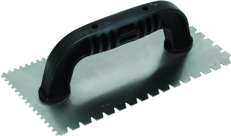 Flat V notched pattern with 10 deg cutback. Used to spread adhesive or mastic before laying tile, carpet or other floor coverings. Black plastic handle with full hardened steel blade.