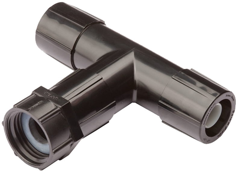 Rain Bird Drip Irrigation Tee with FHT Adapter, Universal, 3/4 x 1/2 in Connection, FHT x Compression Connection, Polyethylene, Black, 0 to 60 psi Pressure, Suitable for: 1/2 in End Closure, 3/4 in x 1/2 in FHT x MTH Adapter, 1/2 to 5/8 in Tubing