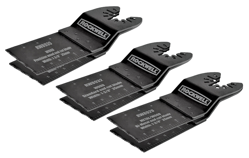 Includes (2) precision wood end cut blade for aggressive plunge cutting in wood, (2) standard wood end cut blade for general-purpose cutting and (2) bi-metal-metal/wood end cut blade for cutting up to 1-5/8 in depth on wood, plastics, drywall, fiberglass, nails, non-ferrous metals, thin sheet metal and hardened fillers. 1-3/8 in blades. Universal fit system allow accessory to fit all major brand oscillating tools.