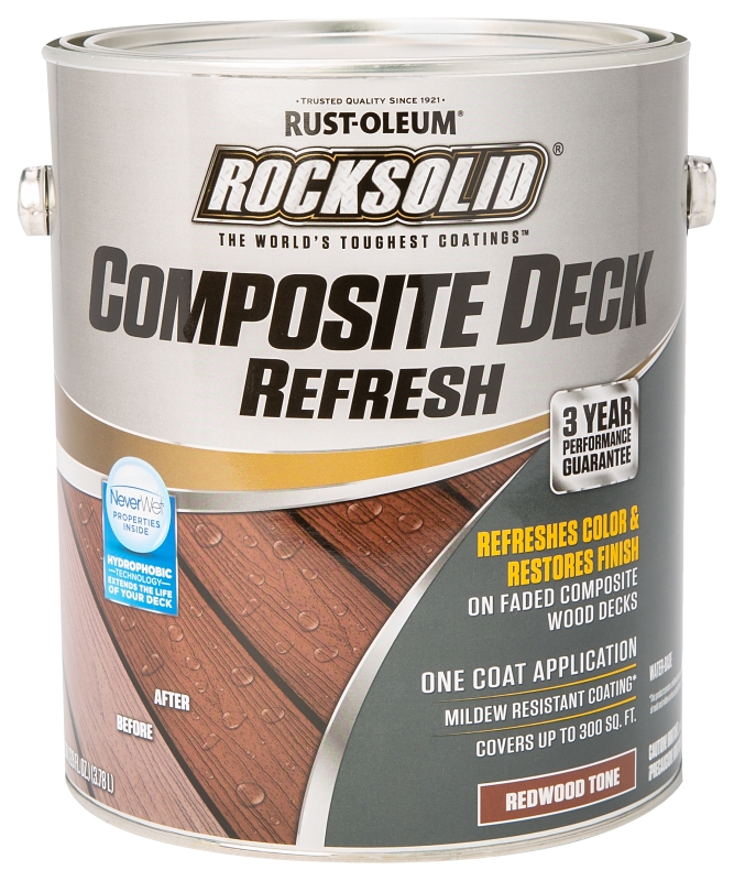 RockSolid® composite deck refresh toner is an exceptional water-base exterior toner designed to refresh the color and restore the finish on faded composite wood decks. It provides protection against water damage, UV graying and mildew. It is easy to use, dries fast and cleans up quickly with water.