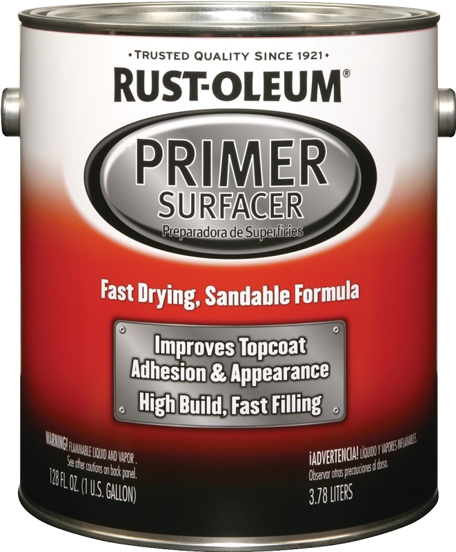 Rust-Oleum Primer surfacer is designed to improve adhesion of the final topcoat and enhance the finish color. When brush or spray applied, this high build, rust resistant, sandable primer will hide sanding scratches and fill uneven surfaces. This product must first be combined with an equal 1:1 part of Rust-Oleum 248877 specialty reducer before spray application. This all purpose primer is suitable for use on metal, fiberglass and wood. Do not use of surfaces that will come into direct contact with heat or temperatures exceeding 350 deg F.