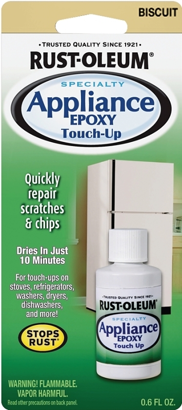 Rust-Oleum® SPECIALTY APPLIANCE touch-up repairs scratches and chips on refrigerators, washers, dryers, dishwashers and other non-heated surfaces (do not apply to ovens or stoves). Applies to metal, porcelain and enamel surfaces. Includes a tapered brush underneath the cap.