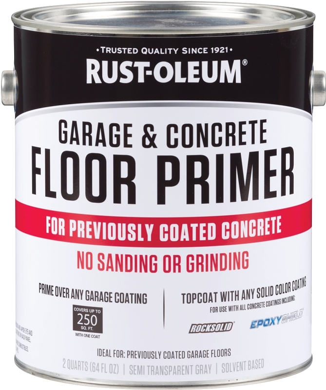 Rust-Oleum garage and concrete floor primer is a ultra-premium, solvent based primer/bonder with excellent top coat adhesion and has been developed to be used over previously coated garage floors. No sanding, stripping or grinding is required. The previously coated floor must be clean and properly adhered prior to priming. After use of the Rust-Oleum garage and concrete primer, your floor is ready to be topcoated with any opaque epoxy paint, 2-part epoxy or RockSolid polycuramine. Use of clear topcoats over Rust-Oleum garage and concrete primer is not recommended.