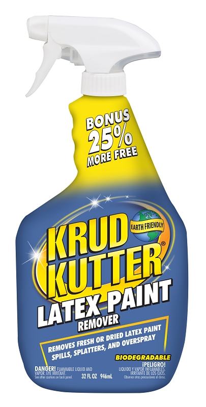 Krud Kutter® latex paint remover is a proprietary solution that removes fresh or dried latex paint from a variety of surfaces. Perfect for cleaning paint spills or roller splatter. The biodegradable, low VOC formula will remove even old, fully cured latex paint. Ideal for use on hard, soft and porous surfaces including carpet, fabric, concrete, brick, wood, vinyl flooring and trim, laminate, tile, ceramic and more.