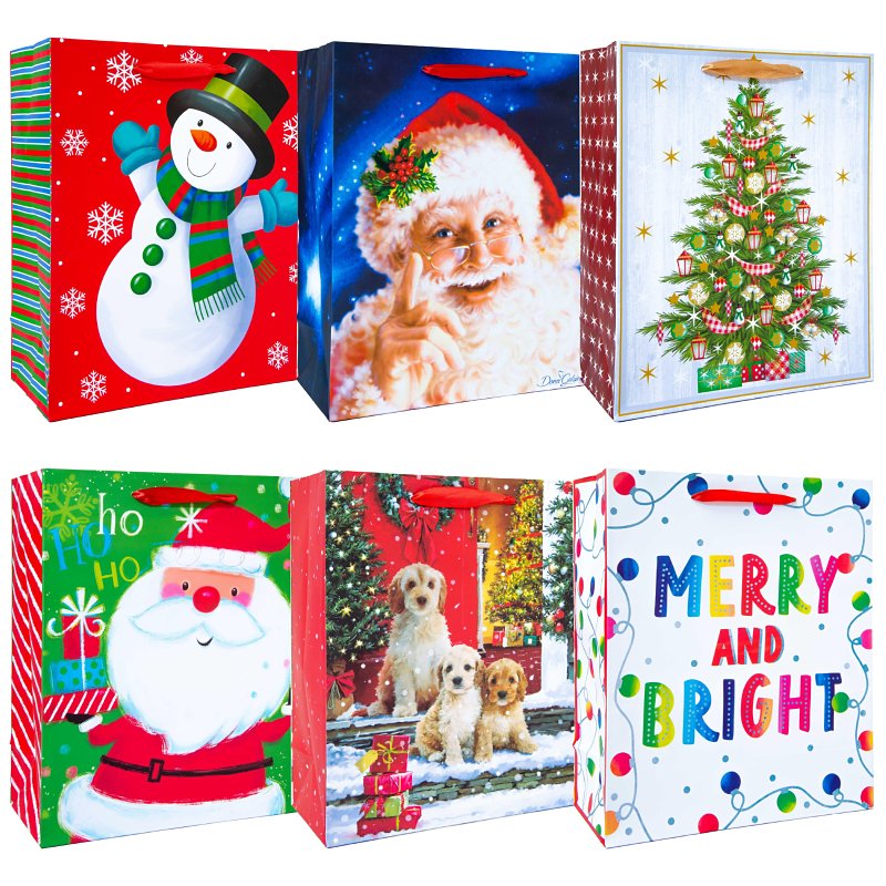Large, vertical gift bag with handle. They come in different Christmas prints. You can skip the wrapping paper and gift wrapping with these Christmas bags.