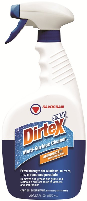 The top-rated extra-strength ammoniated spray cleaner for cleaning many surfaces around the home or office. Excellent for glass, chrome, porcelain, ceramic tile, appliance enamels and more. Removes dirt, grease and grime with just a wipe and also removes latex paint overspray. Spray Dirtex® has a pleasant odor and contains no fluorocarbons.