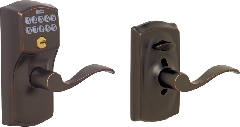 Keypad lever with Flex Lock with Camelot trim and Accent lever in aged bronze.
