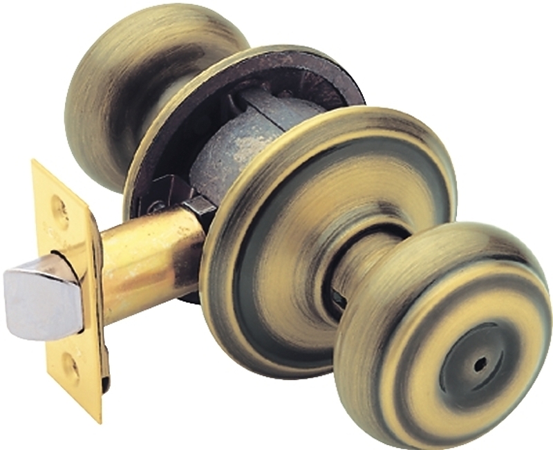Georgian knob bed and bath lock in antique brass.