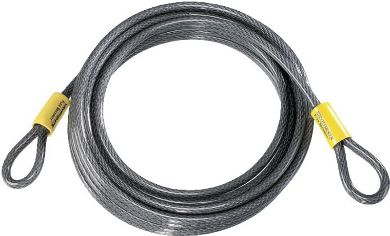 Braided steel vinyl-coated cable with extra long oversized swages. Double loop design allows cinching for more usable length and more flexible lock-up options with Kryptonite padlock or any padlock. 3/8 in Dia cable.