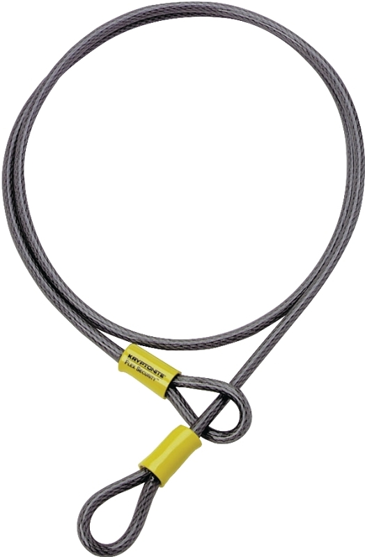 Braided steel vinyl-coated cable with extra long oversized swages. Double loop design allows cinching for more usable length and more flexible lock-up options with Kryptonite padlock or any high security padlock. 5/8 in Dia cable.