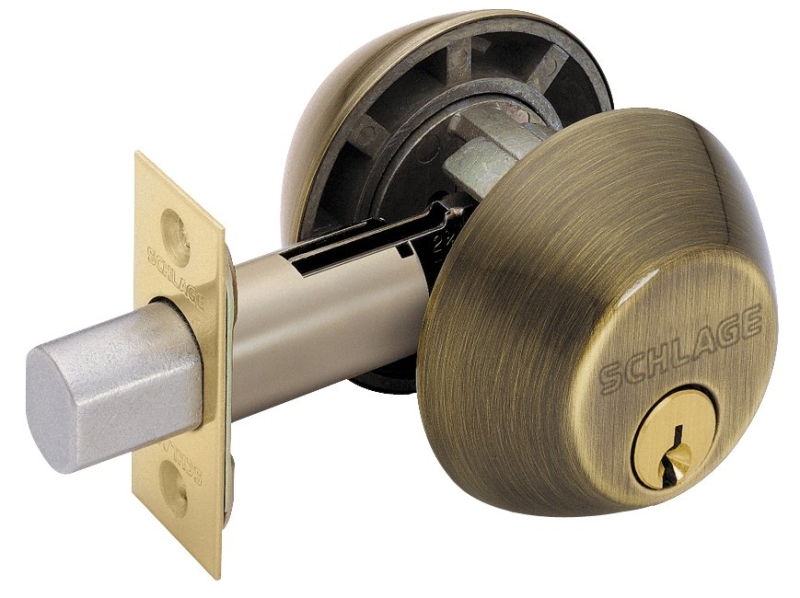 Double cylinder deadbolt in antique brass.