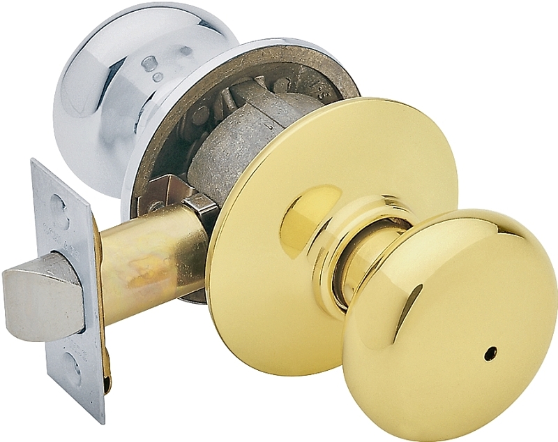 Plymouth knob bed and bath lock in bright brass and bright chrome.