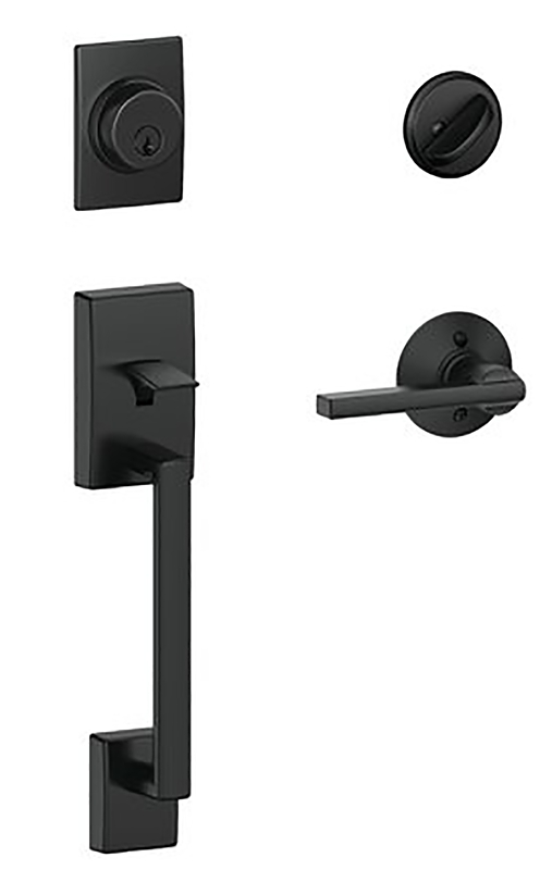 Century handleset with single cylinder deadbolt and Latitude lever in matte black.