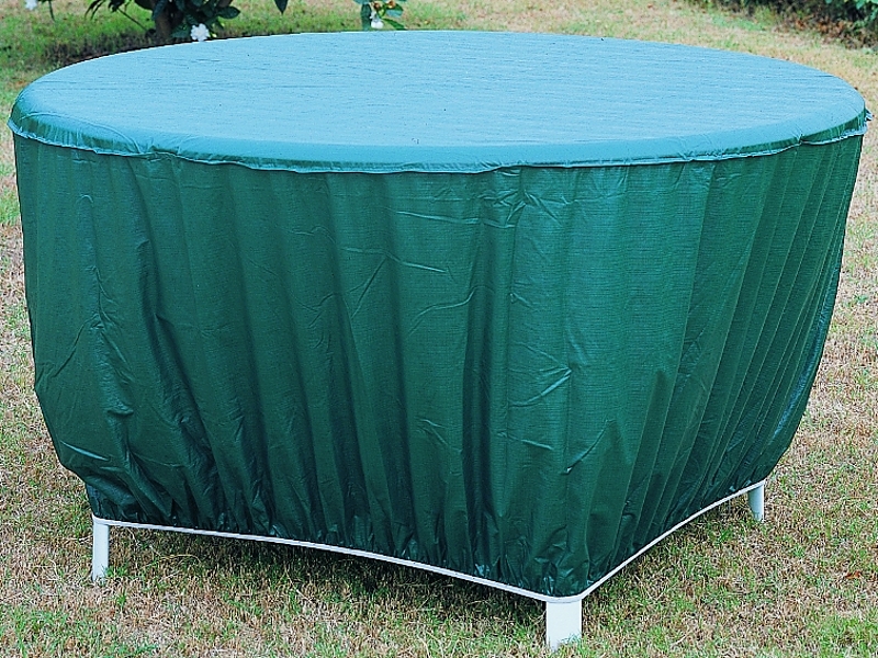 Embossed green vinyl for all-season protection from weathering and discoloring. Elastic bottom holds cover in place. Fits most sizes of round tables and small party bars.