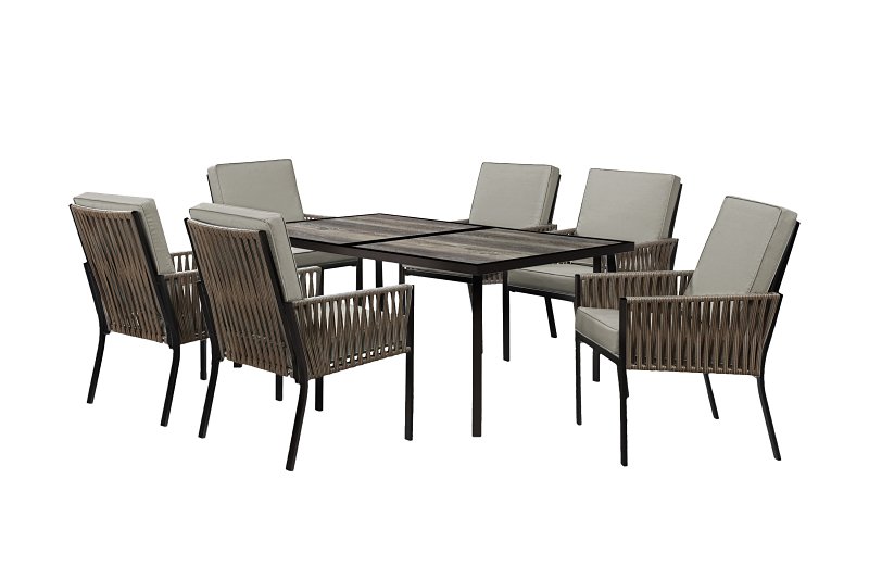 Seasonal Trends Dining Set, Seating Capacity: 6, Number of Pieces: 7, Table Shape: Rectangular, Tabletop Material: Laminated, Table Color: Woodgrain, Table Length: 66 in, Table Width: 40 in, Table Height: 28 in, Seat Material: Sling, Seat Color: Tan, Seat Height: 15.7 in, Seat Depth: 20 in, Cushion Material: Solution Dye Polyester Fabric, Cushion Color: Tan, Frame Material: Steel, Frame Color: Black, Includes: (6) Chairs and (1) Table