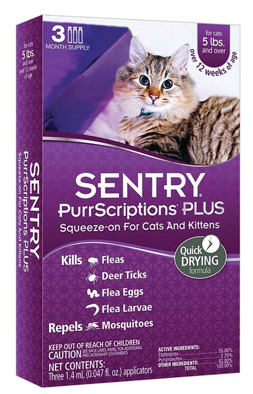 Sentry PurrScriptions Plus Squeeze-on is formulated with an adulticide called Etofenprox. When applied monthly, PurrScriptions Plus kills adult fleas, deer ticks and repels mosquitoes, including the mosquito that carries West Nile virus, for up to one month. This product also includes pyriproxyfen, an insect growth regulator that kills flea eggs and larvae for up to three months per application.