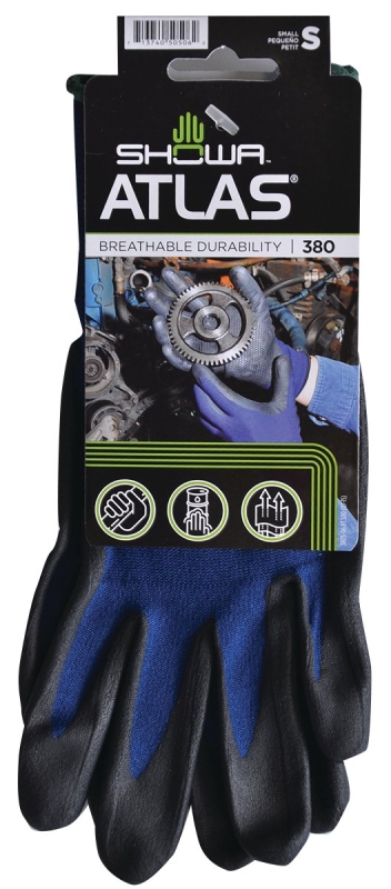 Showa 380S-06.RT Coated Gloves, S, 8-21/32 to 10-15/64 in L, Elastic Cuff, Nitrile Foam Coating, Black/Blue