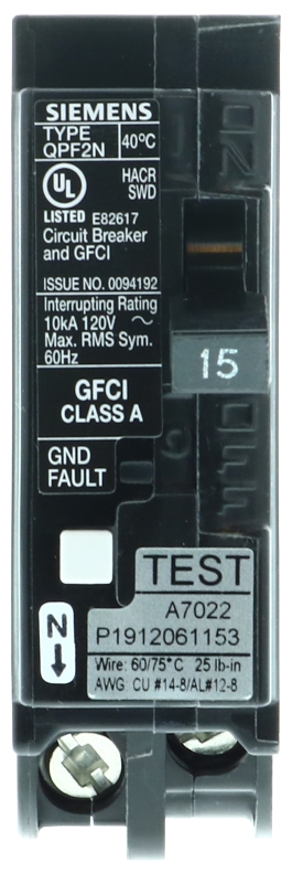 Siemens low voltage plug-in circuit breaker. 15 A 1-pole (10 kA at 120 V) personnel protection ground-fault class 5 mA type QPF2N breaker.