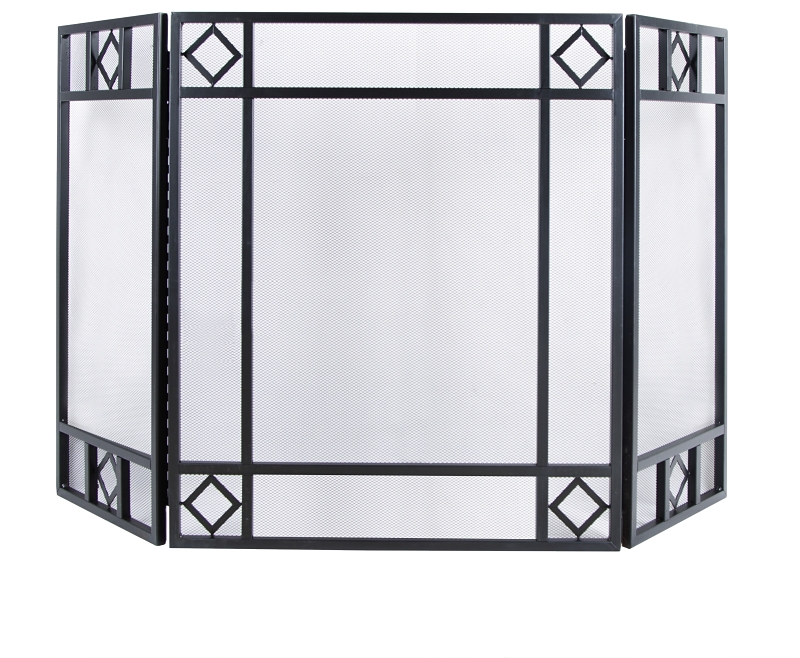 The mesh design tri-fold fire screen with black finish. 30 in H x 52 in W.