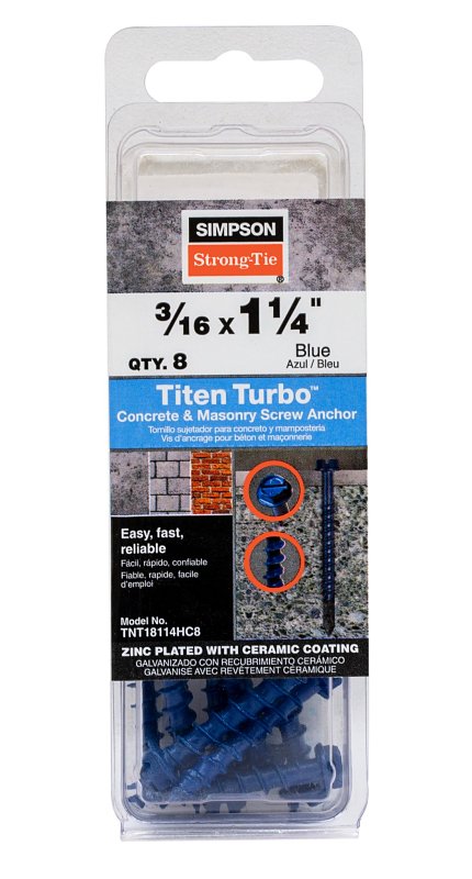 The Titen Turbo™ screw anchor features an innovative torque reduction channel to trap drilling dust where it can’t obstruct thread action, significantly reducing binding, stripping and snapping without compromising strength. The patented reverse thread design enables smooth driving with less torque while providing excellent holding power. The torque reduction channel also allows more space for dust to help prevent anchors from bottoming out in smaller-diameter screw holes. The Titen Turbo™ screw anchors feature a serrated leading edge to cut into concrete or masonry and a pointed tip for fast, easy installation in wood-to-concrete and wood-to-wood anchoring applications.