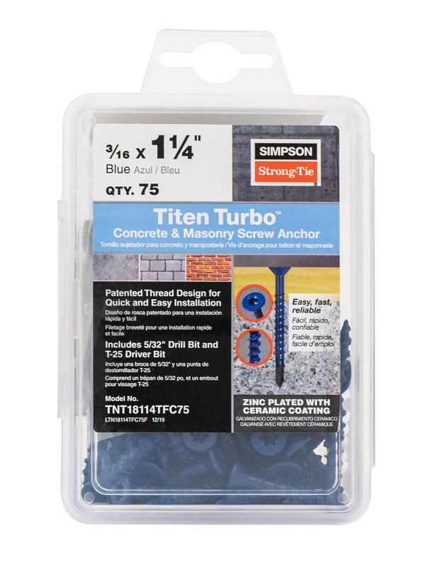 Simpson Strong-Tie Titen Turbo TNT18114TFC75 Screw Anchor, 3/16 in Dia, 1-1/4 in L, Carbon Steel, Zinc Plated