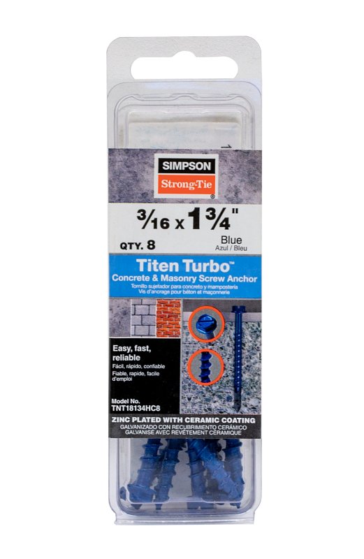 Simpson Strong-Tie Titen Turbo TNT18134HC8 Screw Anchor, 3/16 in Dia, 1-3/4 in L, Carbon Steel, Zinc Plated