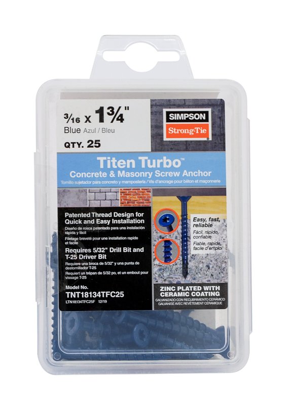 Simpson Strong-Tie Titen Turbo TNT18134TFC25 Screw Anchor, 3/16 in Dia, 1-3/4 in L, Carbon Steel, Zinc Plated