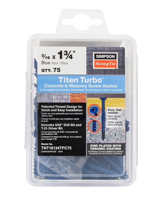Simpson Strong-Tie Titen Turbo TNT18134TFC75 Screw Anchor, 3/16 in Dia, 1-3/4 in L, Carbon Steel