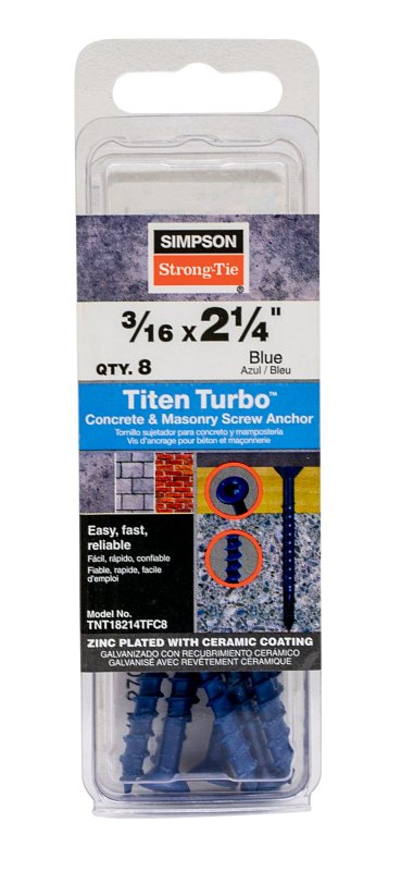 The Titen Turbo™ screw anchor features an innovative torque reduction channel to trap drilling dust where it can’t obstruct thread action, significantly reducing binding, stripping and snapping without compromising strength. The patented reverse thread design enables smooth driving with less torque while providing excellent holding power. The torque reduction channel also allows more space for dust to help prevent anchors from bottoming out in smaller-diameter screw holes. The Titen Turbo™ screw anchors feature a serrated leading edge to cut into concrete or masonry and a pointed tip for fast, easy installation in wood-to-concrete and wood-to-wood anchoring applications.