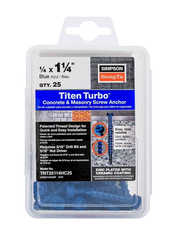 Simpson Strong-Tie Titen Turbo TNT25114HC25 Screw Anchor, 1/4 in Dia, 1-1/4 in L, Carbon Steel, Zinc Plated