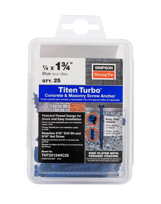 The Titen Turbo screw anchor features an innovative Torque Reduction Channel to trap drilling dust where it can’t obstruct thread action, significantly reducing binding, stripping and snapping without compromising strength. The patented reverse thread design enables smooth driving with less torque while providing great holding power. The Torque Reduction Channel also allows more space for dust to help prevent anchors from bottoming out in smaller-diameter screw holes. The Titen Turbo screw anchors feature a serrated leading edge to cut into concrete or masonry and a pointed tip for fast, easy installation in wood-to-concrete and wood-to-wood anchoring applications.