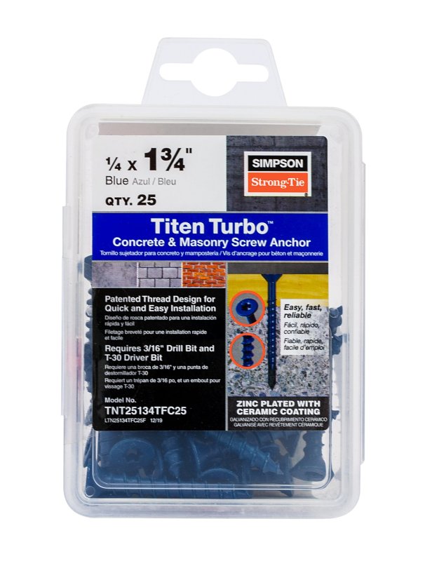 The Titen Turbo™ screw anchor features an innovative torque reduction channel to trap drilling dust where it can’t obstruct thread action, significantly reducing binding, stripping and snapping without compromising strength. The patented reverse thread design enables smooth driving with less torque while providing excellent holding power. The torque reduction channel also allows more space for dust to help prevent anchors from bottoming out in smaller-diameter screw holes. The Titen Turbo™ screw anchors feature a serrated leading edge to cut into concrete or masonry and a pointed tip for fast, easy installation in wood-to-concrete and wood-to-wood anchoring applications.