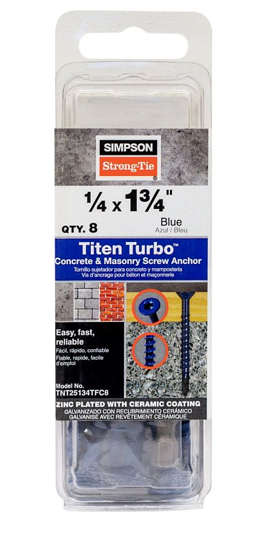 The Titen Turbo™ screw anchor features an innovative torque reduction channel to trap drilling dust where it can’t obstruct thread action, significantly reducing binding, stripping and snapping without compromising strength. The patented reverse thread design enables smooth driving with less torque while providing excellent holding power. The torque reduction channel also allows more space for dust to help prevent anchors from bottoming out in smaller-diameter screw holes. The Titen Turbo™ screw anchors feature a serrated leading edge to cut into concrete or masonry and a pointed tip for fast, easy installation in wood-to-concrete and wood-to-wood anchoring applications.