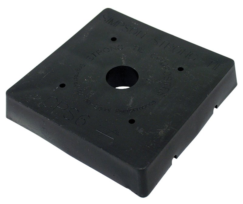 The CPS is a composite plastic stand-off base designed for use both indoors and outdoors. The CPS attaches to the bottom of the solid wood column and to concrete with threaded rod and epoxy. The CPS is load-rated and features either a square or a rectangle shape depending upon post dimensions.