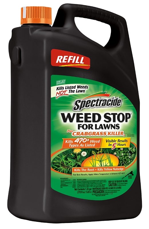 Use Spectracide Weed Stop for lawns plus crabgrass killer to kill over 470 types of weeds as listed, including crabgrass. The product produces visible results in 5 hr. This product kills broadleaf and troublesome grass weeds including dandelion, chickweed and clover as well as crabgrass, foxtail and yellow nutsedge. Apply when daytime temperatures are between 45 deg F and 90 deg F. Do not apply to Bermuda grass when daytime temperatures exceed 85 deg F.