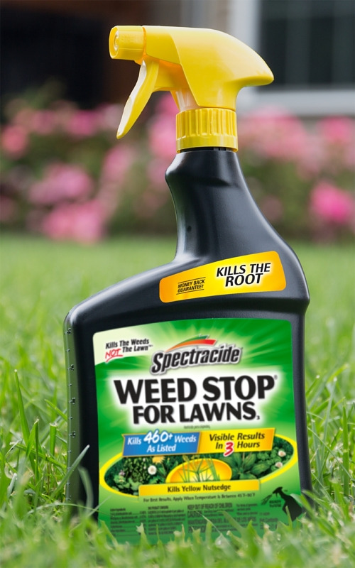 Spectracide® Weed Stop® for lawns kills all types of listed broadleaf weeds including dandelion, chickweed, clover and yellow nutsedge. This product treats bluegrass, fescue, zoysia, Bermuda and perennial ryegrass. For best results, apply between 45 and 90 deg. Above 45 deg F, the better the weeds will be able to absorb the product. Spectracide Weed Stop for lawns concentrate kills by contact and kills weed roots. Controls 460 plus weeds as listed, giving you visible results in 3 hr. When used as directed, this product kills the weeds, not the lawn™.