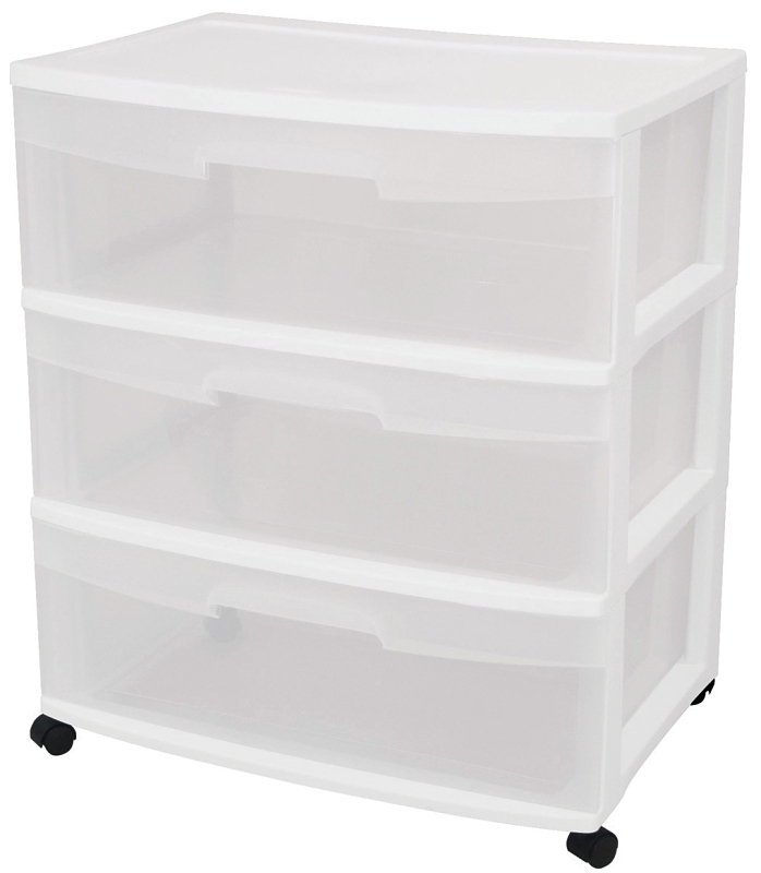 The wide 3-drawer cart features three wide, clear drawers that allow for easy identification of contents. This cart is ideal for organizing clothing and linens in the bedroom and bathroom. Casters are included to create a rolling storage option.