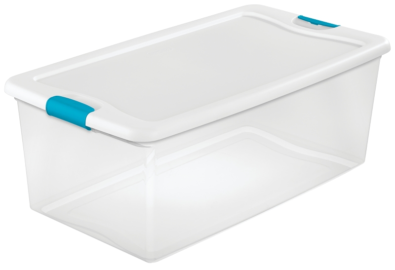 The 106 qt latching box features a modern space saving shape and an innovative hinging lid. Simply undo one latch and lift the lid for easy access, all with one hand. The other latch stays attached and acts as a hinge, even when the lid is opened all of the way. This latching box is ideal for storing camping gear, blankets and other bulky items around the home.