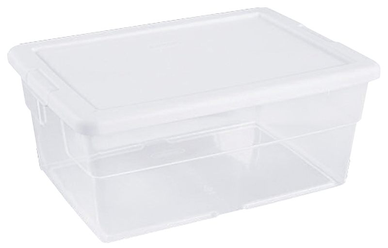 The 16 qt storage box features a clear base that allows contents to be easily identified. The opaque lid snaps firmly onto the base to keep contents contained and secure. This storage box is ideal for storing small items around the home and fits conveniently on 16 in wire closet shelving, making it ideal for organizing and storing small items in the closet.