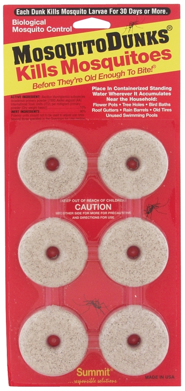 Kills Mosquitoes before they’re old enough to Bite!® The Mosquito Dunks® are America’s excellent selling home owner mosquito control product. The only product with BTI, a bacteria toxic only to mosquito larvae, that lasts 30 days and treats 100 sq-ft of surface water.